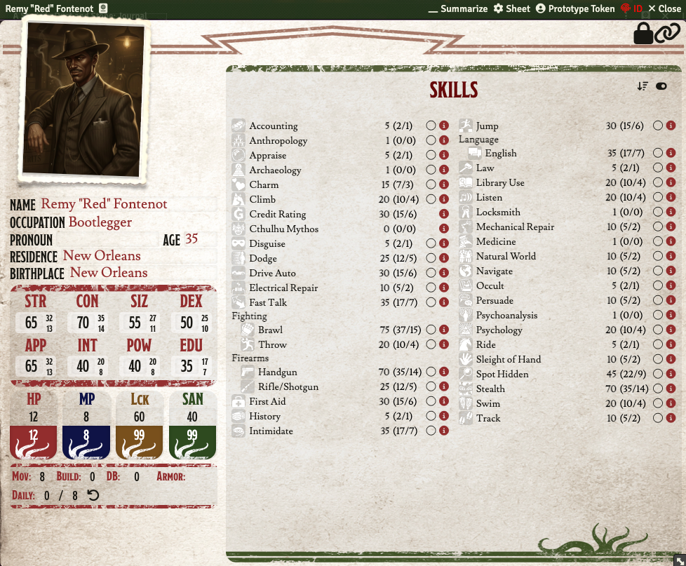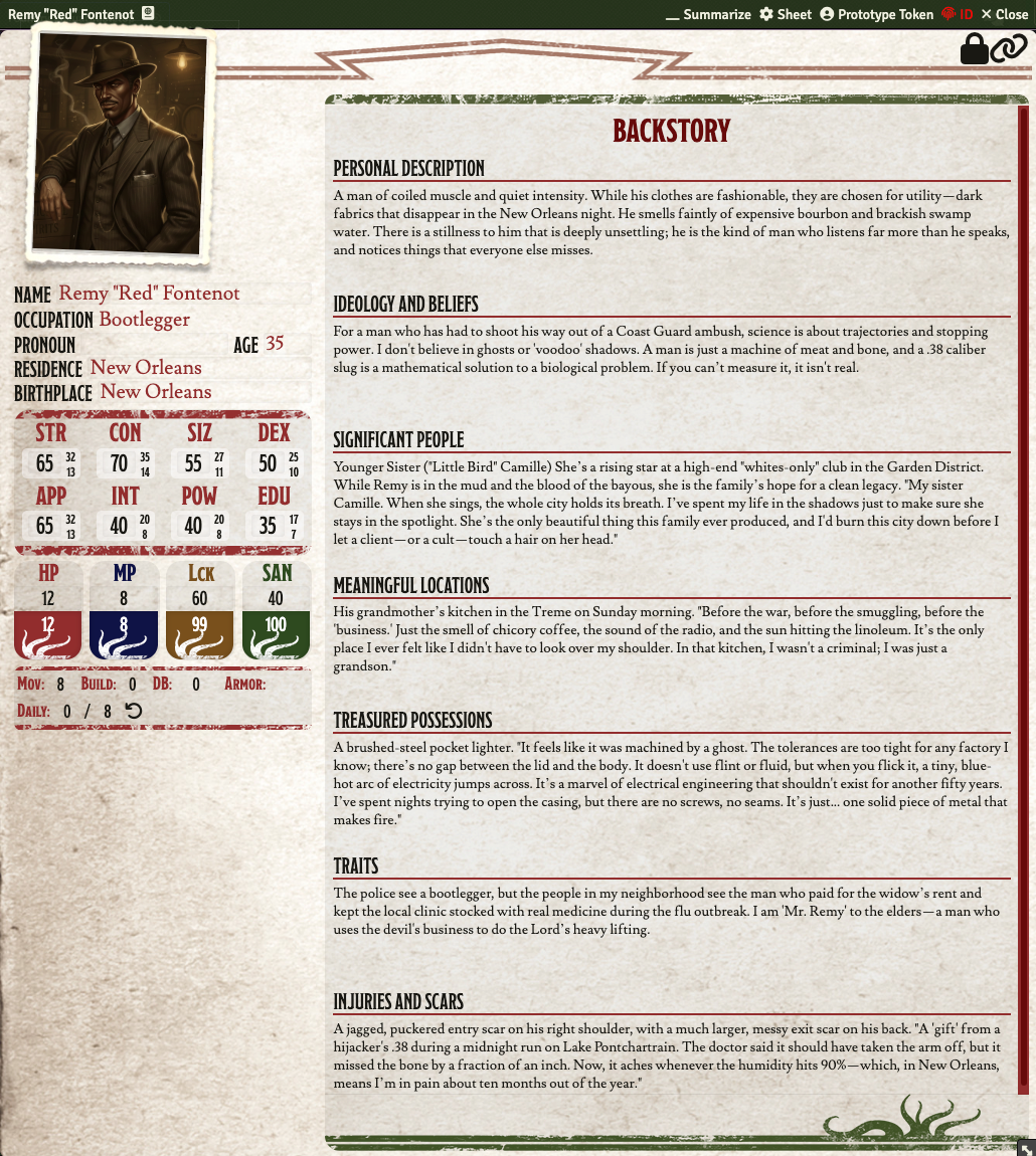 Session 0 of the scenario "A study in Dust and Stone" for Call of Cthulhu 7th ed., where we meet Remy "Red" Fontenot, bootlegger form New Orleans.