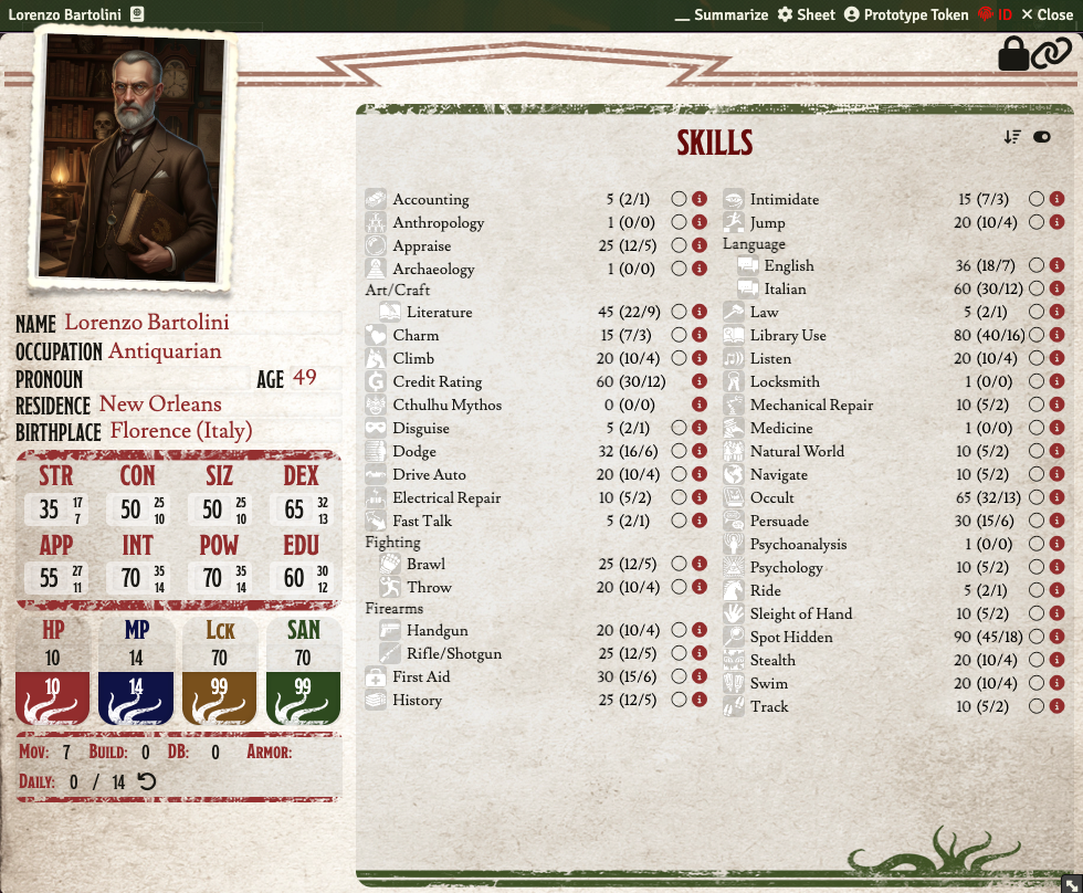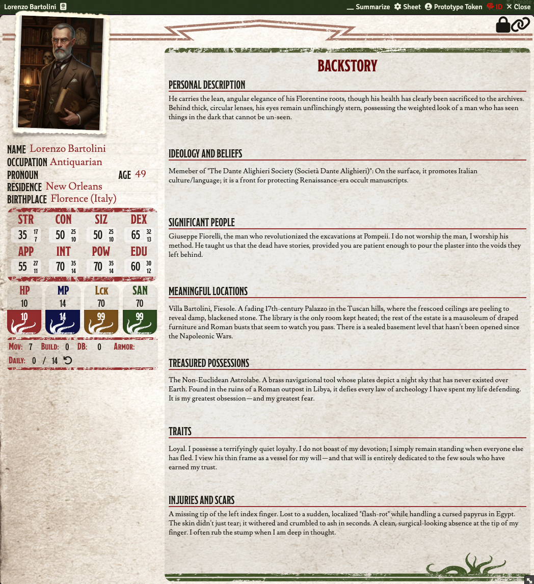 Lorenzo is a scholar, not a brawler. In the lethal world of Call of Cthulhu, his low combat stats are a looming death sentence—a fact I plan to mitigate by introducing a combat-capable "hired hand" backup character later.
