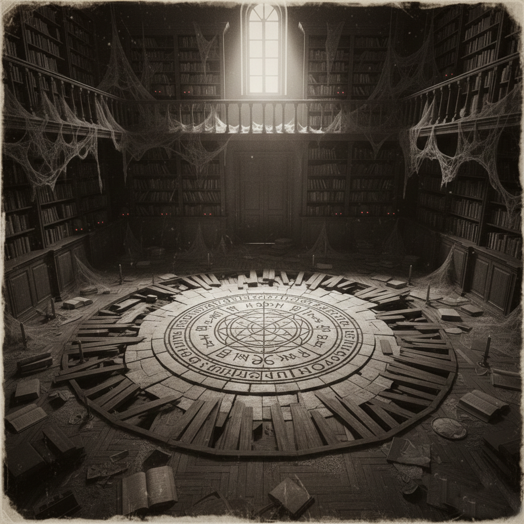 "Master Bartolini, the rains were unholy. They clawed through the roof of the library and rotted the very floorboards. When I pulled up the soaked planks to save the foundation, I found... it. A floor of cold stone beneath the wood, and upon it, a design made of set pebbles. I had our neighbor, Ms. Ravini, photograph it. Master, the sight of it curdles the milk in my stomach. I have covered it with a tarp, but I can still feel it through the soles of my shoes."